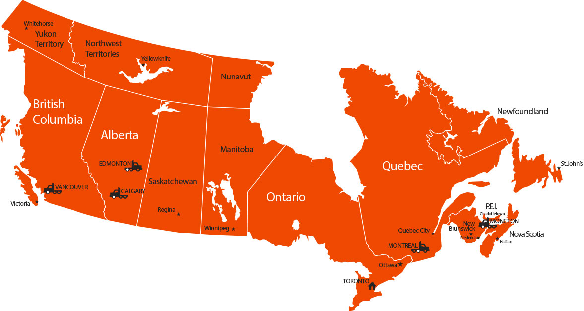 Nos terminaux se situent à Toronto, Montréal, Vancouver et Edmonton. Cliquez sur les emplacements indiqués sur la carte pour consulter une liste des services proposés.